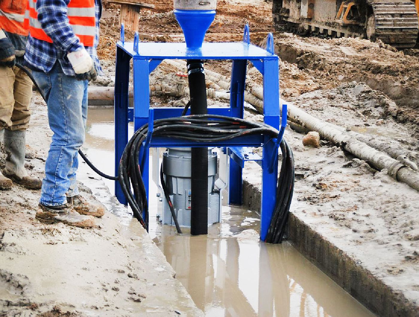 Pompy mogą być podwieszone na linie, zamontowane na sztywno na wysięgniku koparki lub zamontowane na platformie pływającej.
